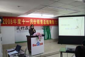 寒流襲擊,天氣驟冷,凍結(jié)不了我們熾熱的冠軍夢。2008年12月6日上午,我司11月銷售總結(jié)大會在公司7樓會議室開展得如火如荼。此次會議實現(xiàn)了從純娛樂向分享經(jīng)驗?zāi)J降霓D(zhuǎn)變,除了常規(guī)的歌曲表演、小品表演、“金典故事”講述外,我們更偏重于大家銷售經(jīng)驗、工作心得及個人見解的分享。一個人就是一個哈姆雷特,我們的銷售精英們個個經(jīng)驗豐富,演講起來一點也不遜于王安之等高級培訓(xùn)講師,相比之下更具有實用價值,更貼近我們的生活。
