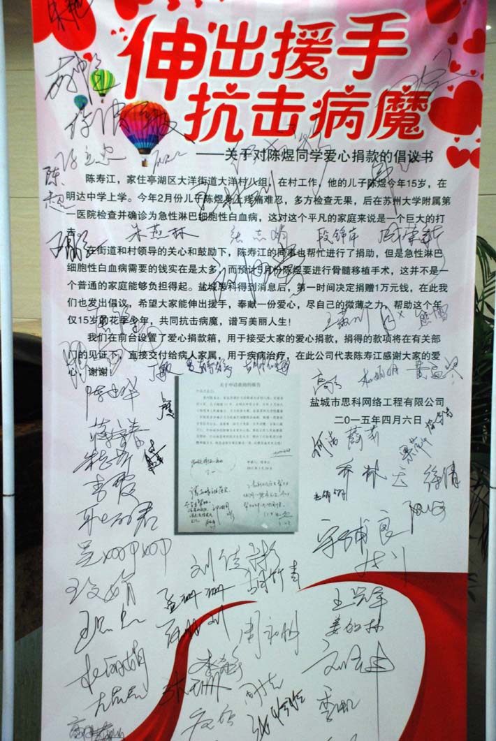 4月7日,在公司領(lǐng)導(dǎo)的關(guān)心和倡議下,鹽城思科全體員工發(fā)起了為陳煜同學(xué)愛心捐款的活動(dòng),大家都主動(dòng)從自己的工資里拿出一百、五十、二十、十元……盡自己的微薄之力為陳煜同學(xué)獻(xiàn)上一份愛心,助其抗擊病魔,走出困境。